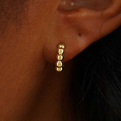 Close up view of a model's ear wearing a 14k yellow gold Mini Puffy Beaded Hoop