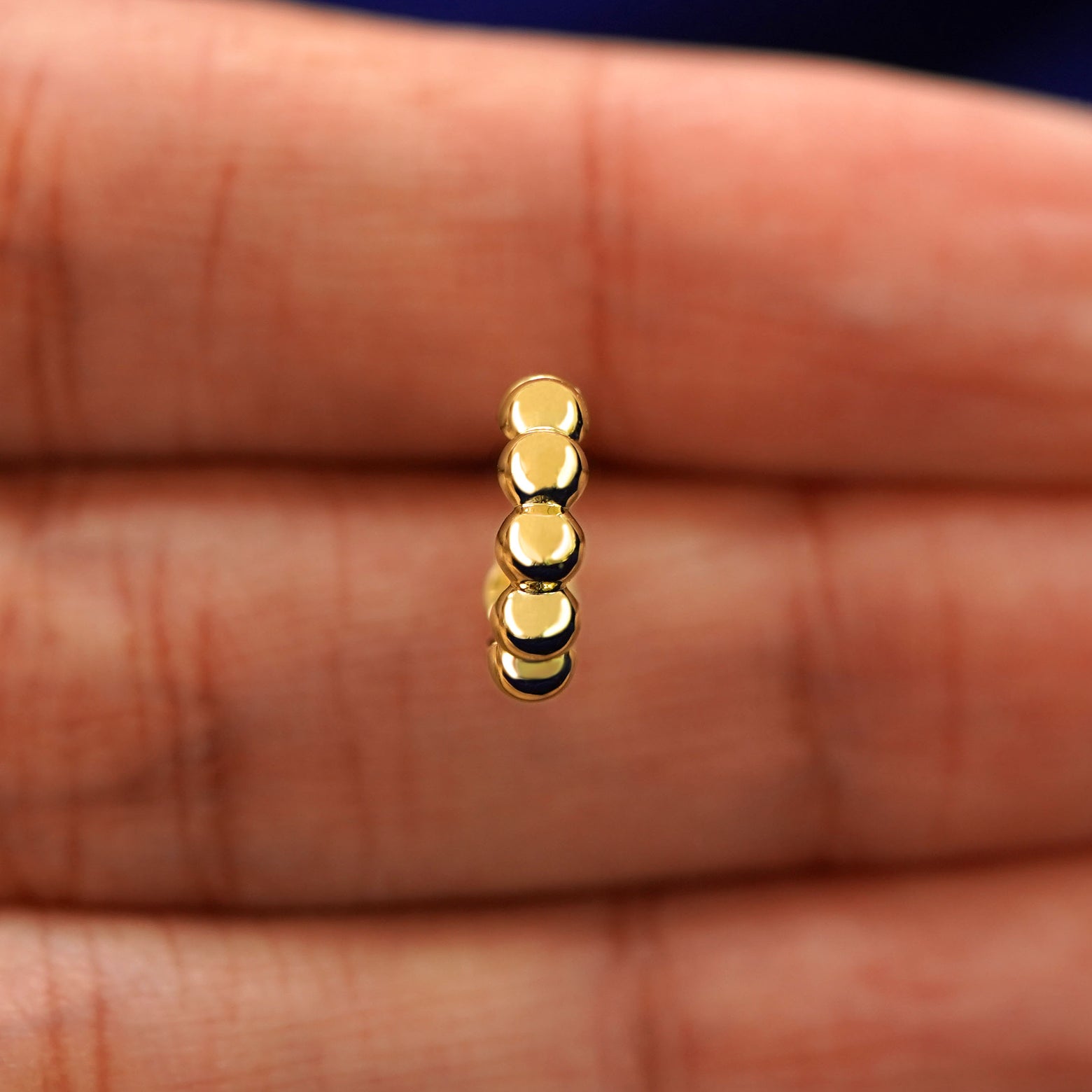 A Mini Puffy Beaded Hoop laying sideways on a model's fingertips to show the details of the post and the side of the hoop