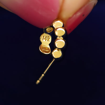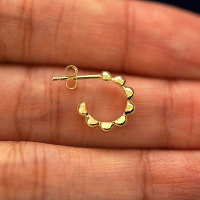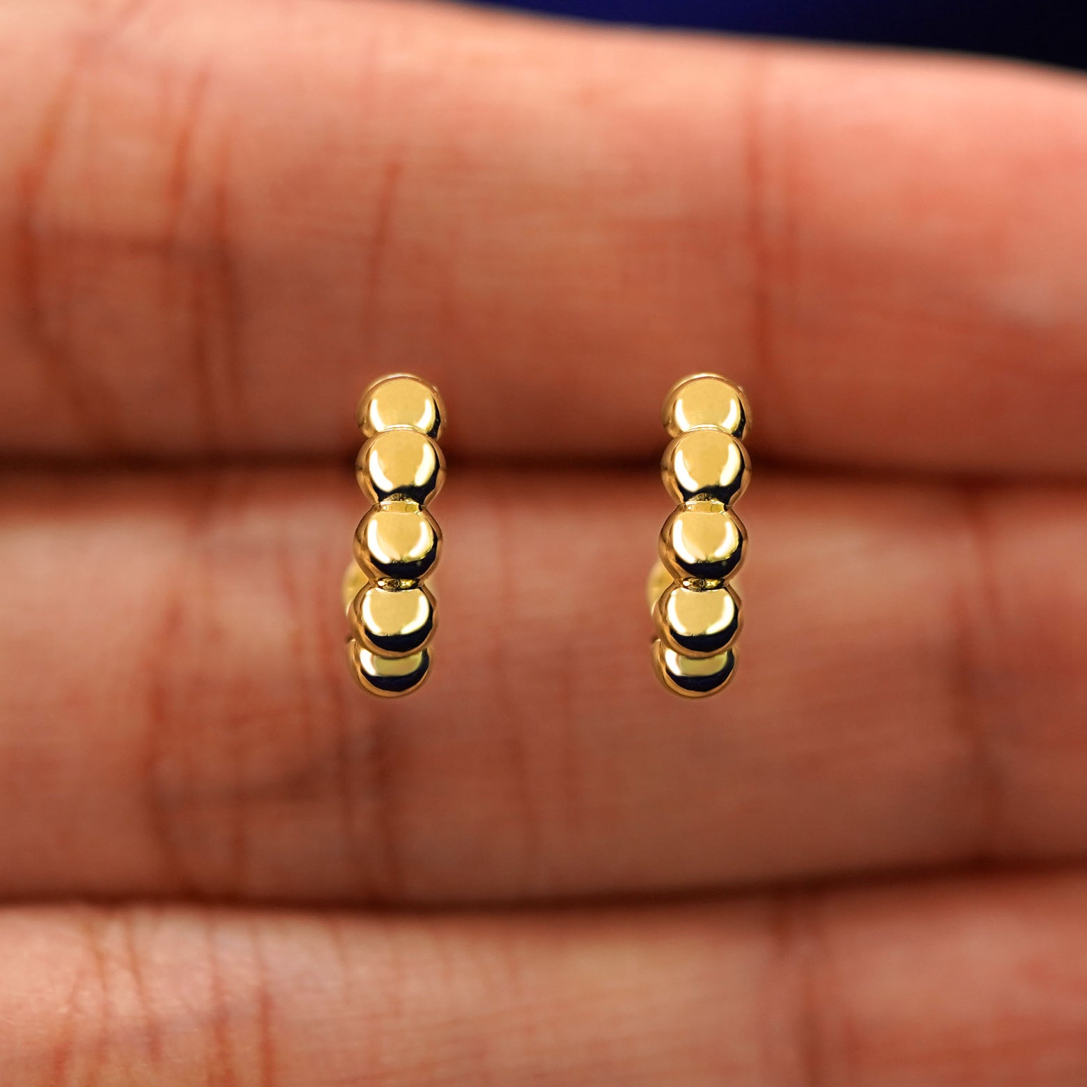 A model's hand holding a pair of 14k yellow gold Mini Puffy Beaded Hoops in between their fingers