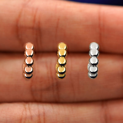 A model's hand holding three Mini Puffy Beaded Hoops in between their fingers in rose, yellow, and white gold