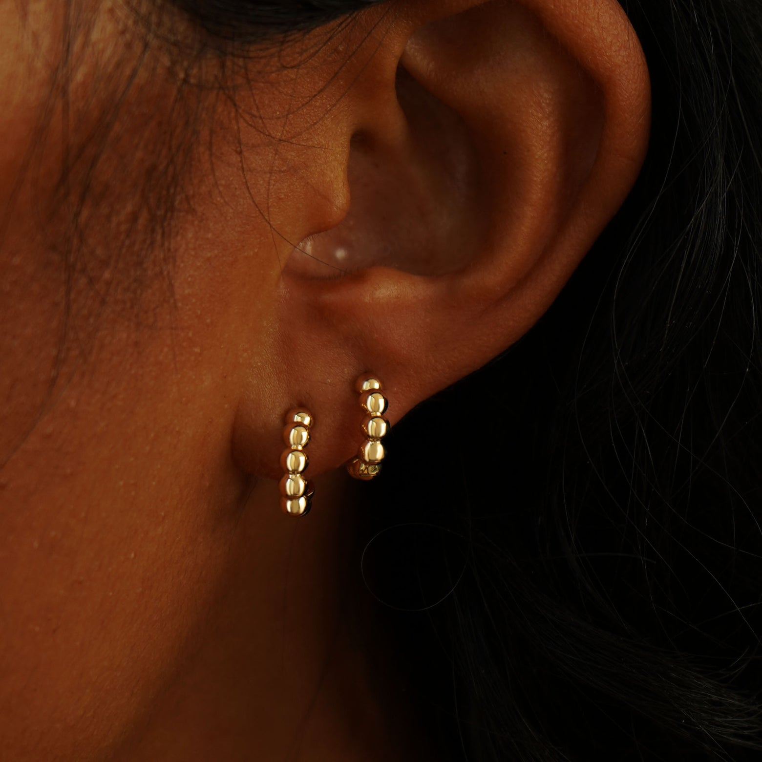 A model's ear wearing two yellow gold Mini Puffy Beaded Hoops in two separate lobe piercings