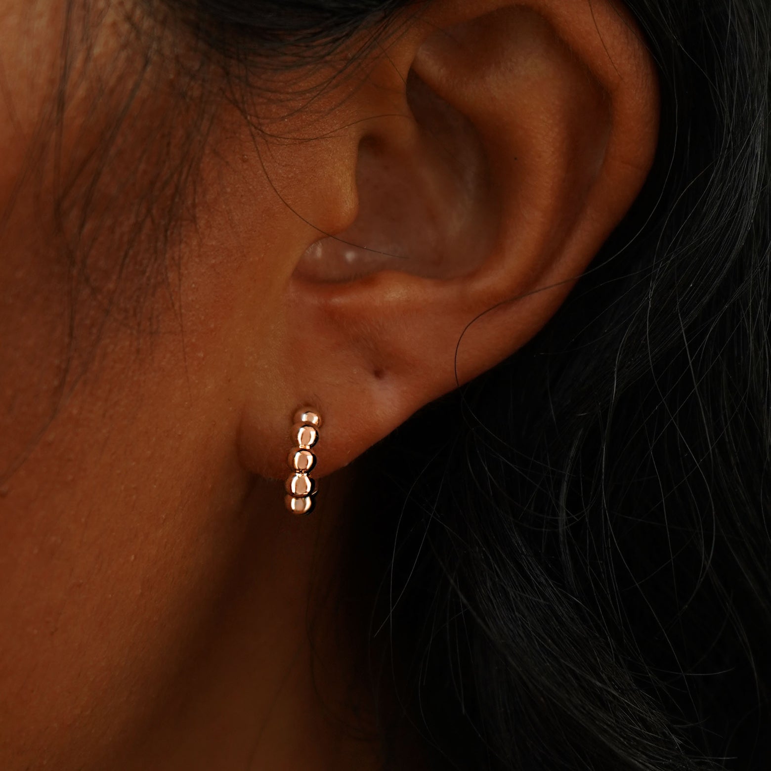 A model's ear wearing a solid rose gold Mini Puffy Beaded Hoop