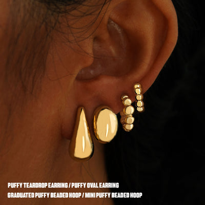 A yellow gold Oval Puffy Earring, Teardrop Puffy Earring, Mini Puffy Beaded Hoop, and Graduated Puffy Beaded Hoop on one ear