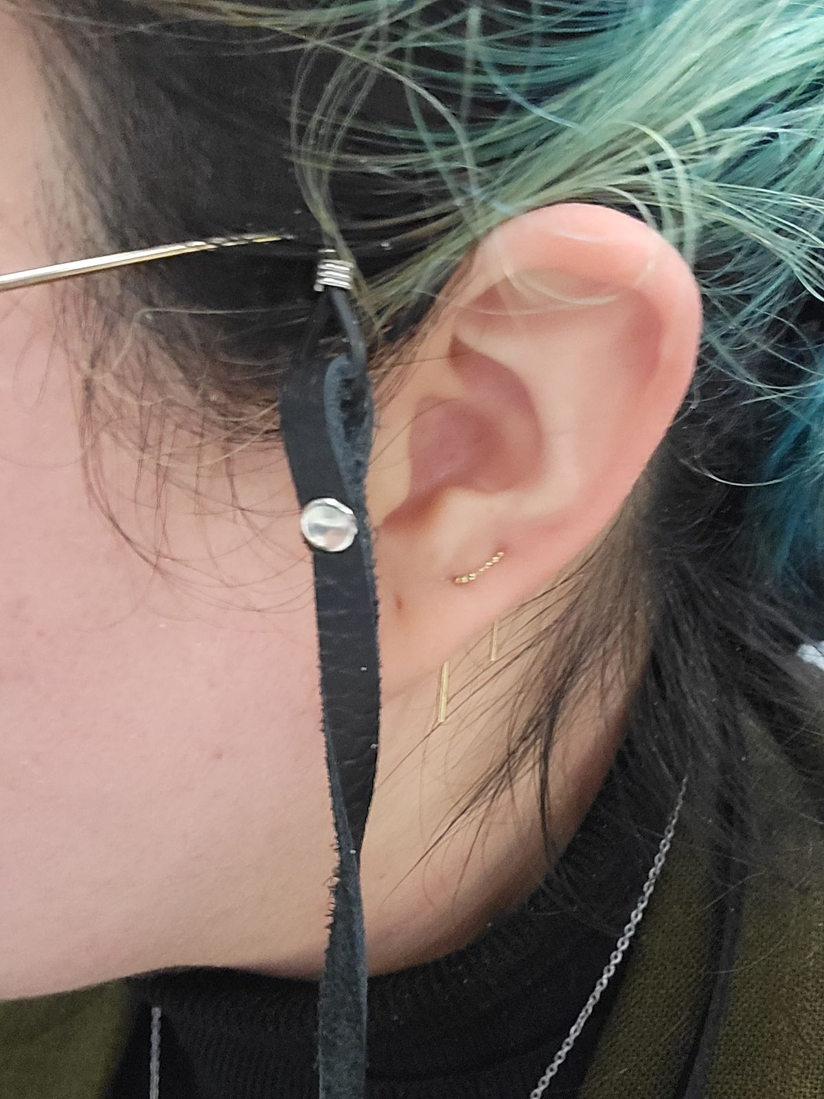 Close up view of a model's ear wearing a Mini Threader across two piercings