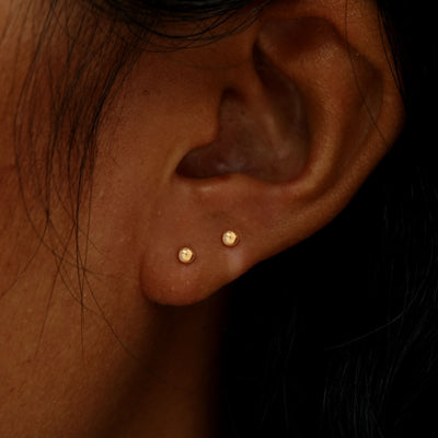 A model's ear wearing two 14k gold Small Ball Flatback Piercings in two lobe piercings