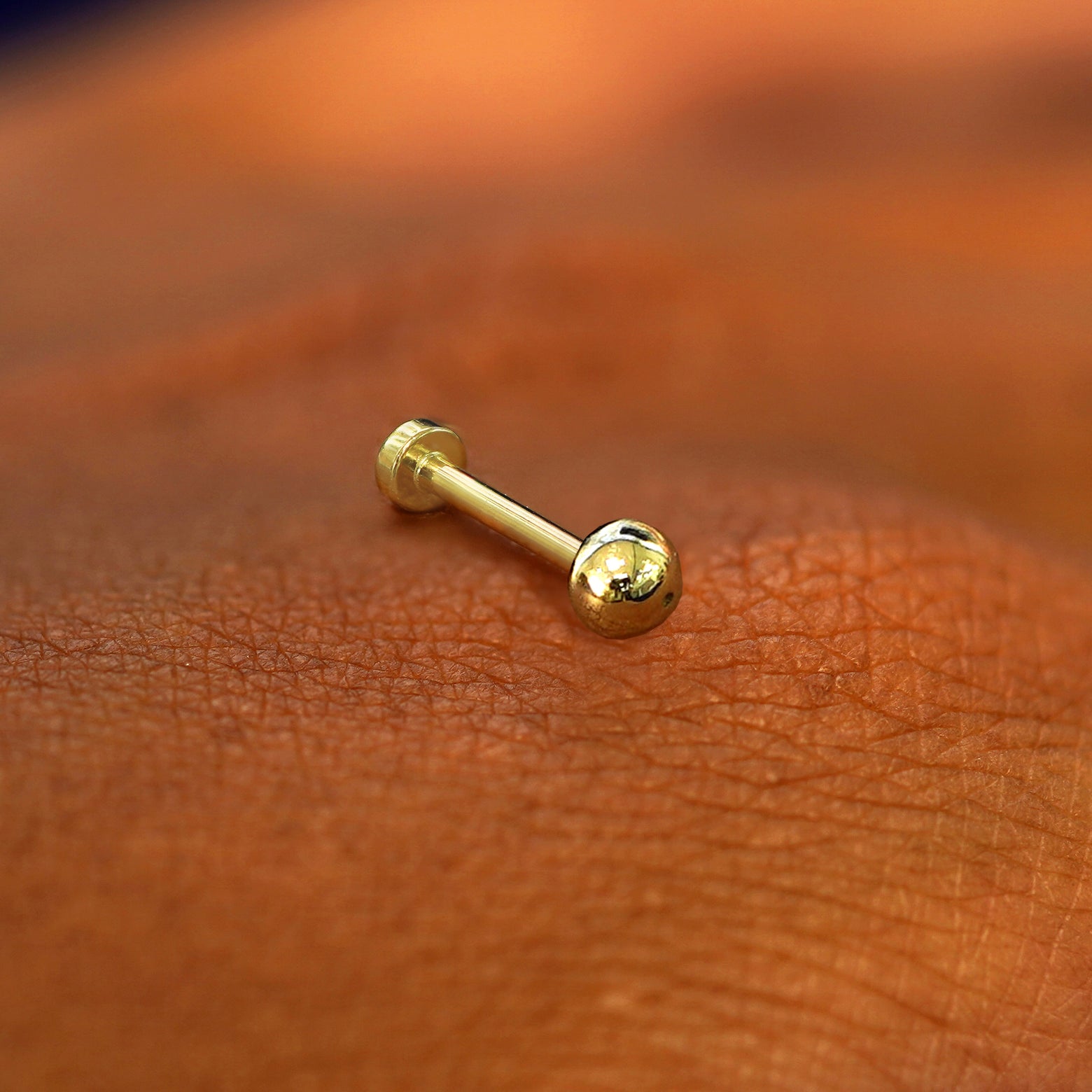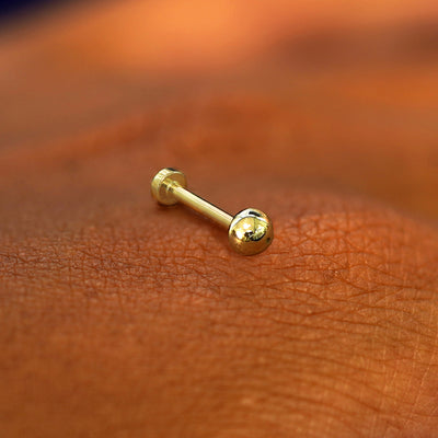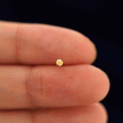 A 14k gold Small Ball Flatback Piercing sitting sideways on a model's fingertips to show detail