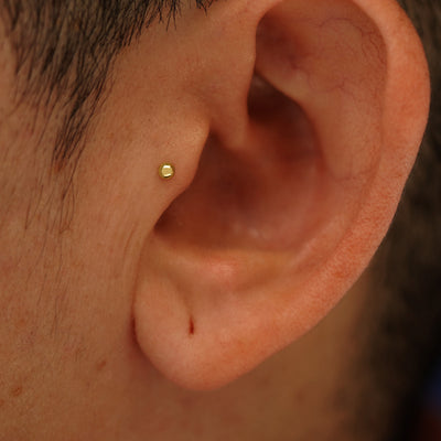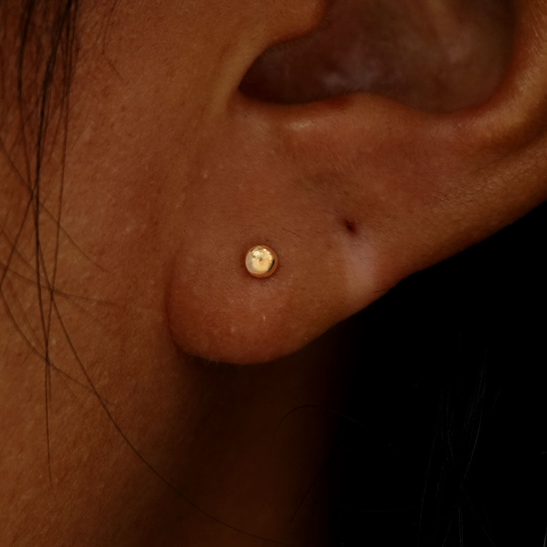 A model's ear wearing a solid yellow gold Small Ball Flatback Piercing