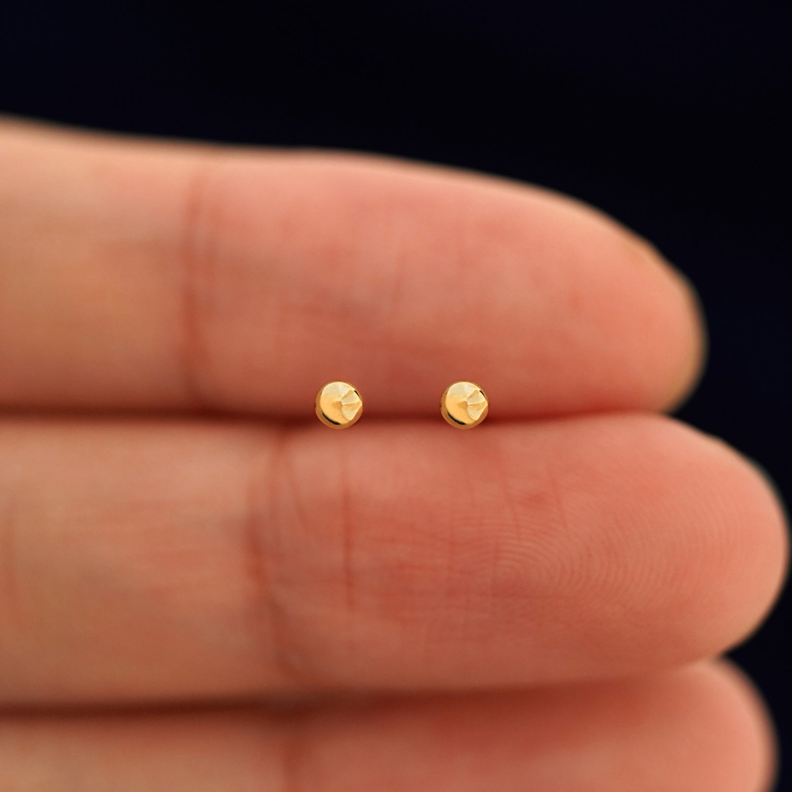 A pair of solid 14k yellow gold Small Ball Flatback Piercing in between a model's fingers