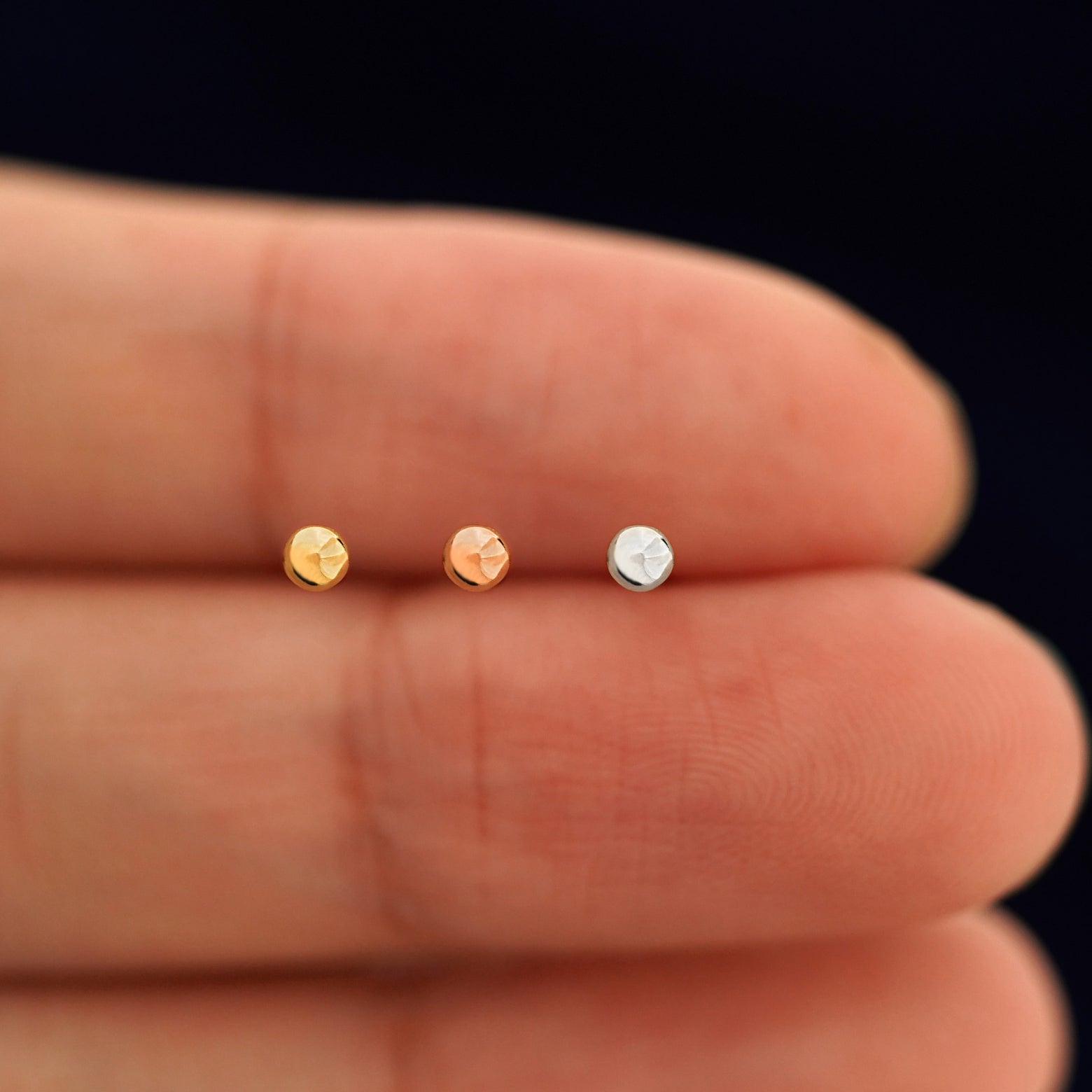 Three versions of the Small Ball Flat Back showing options of yellow, rose, and white gold in between a model's fingers