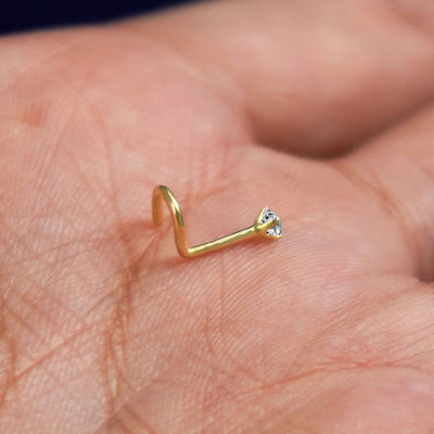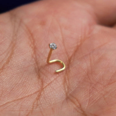 A 14 karat yellow gold Diamond Nose Stud standing upright to show detail and resting in the palm of a model's hand