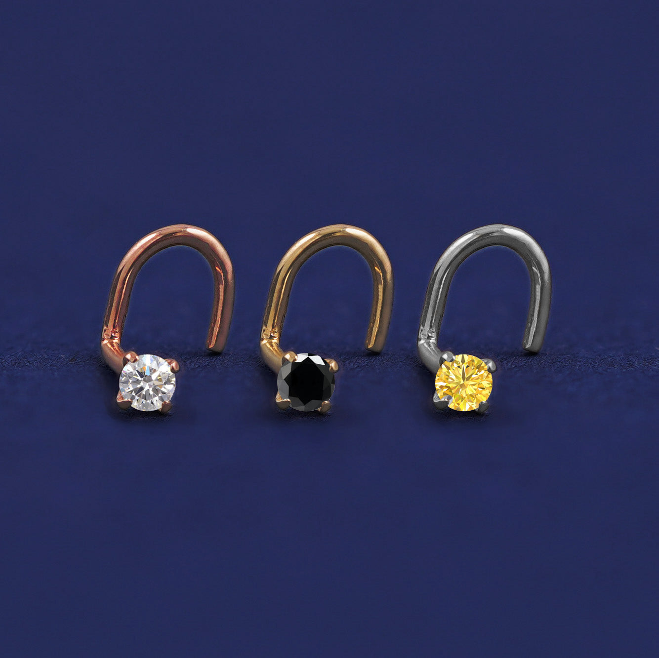 Three versions of the Diamond Nose Stud shown in options of rose, yellow, and white gold