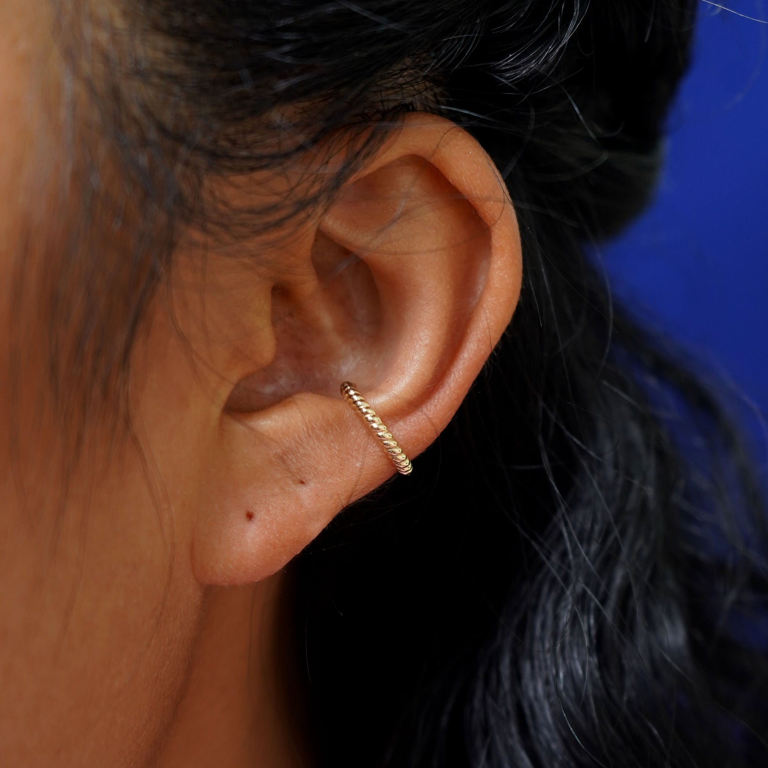 A model's ear wearing a 14k solid yellow gold Rope Cuff