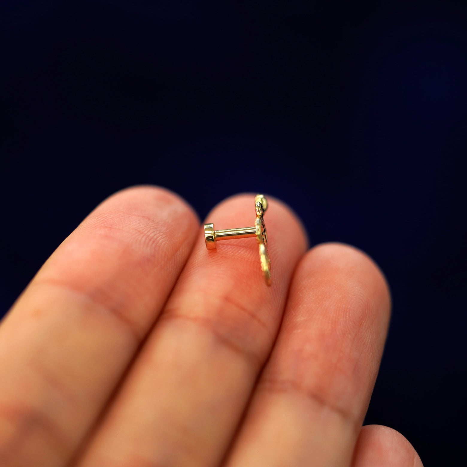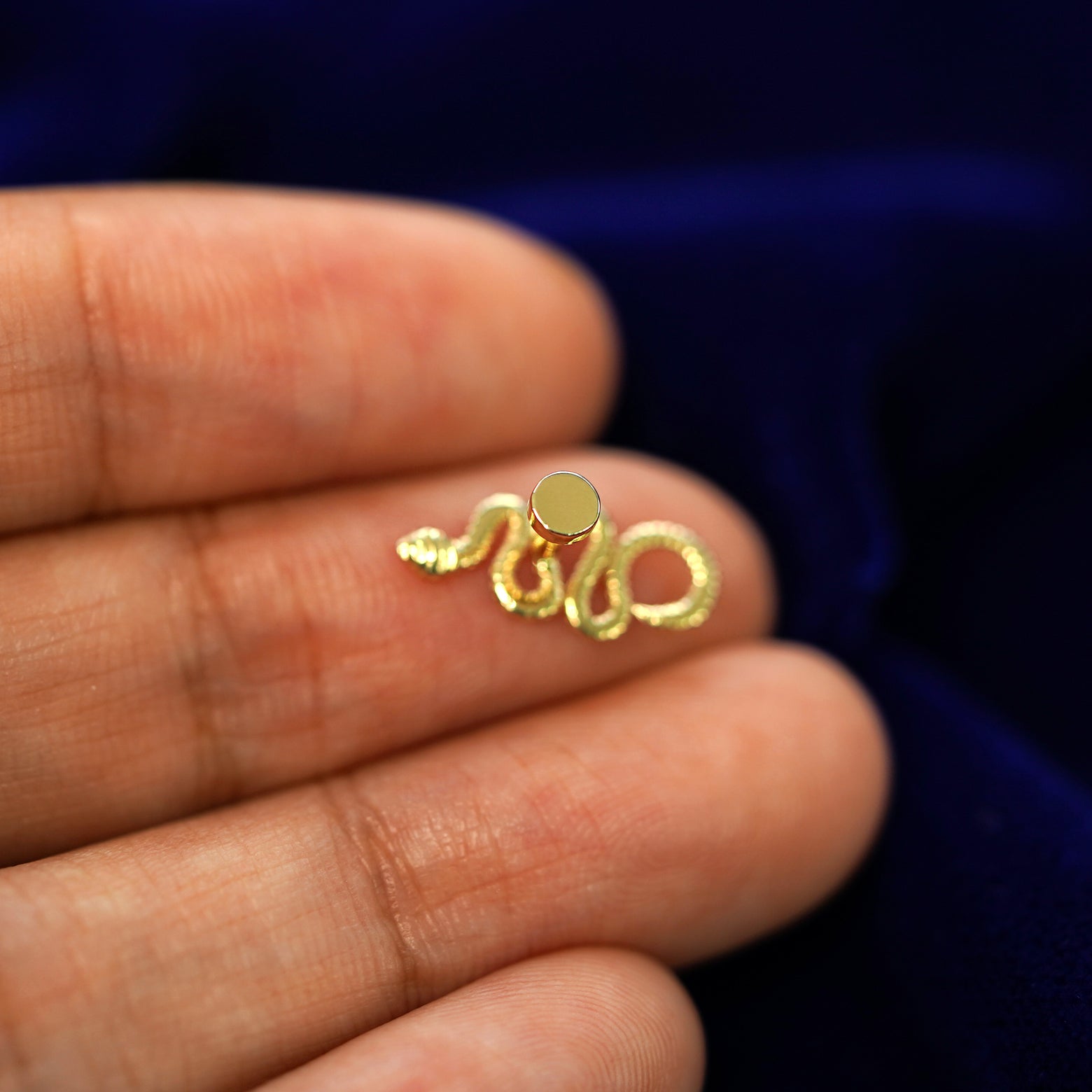 A solid 14k yellow gold Snake Flatback Piercing resting on the back of a model's hand