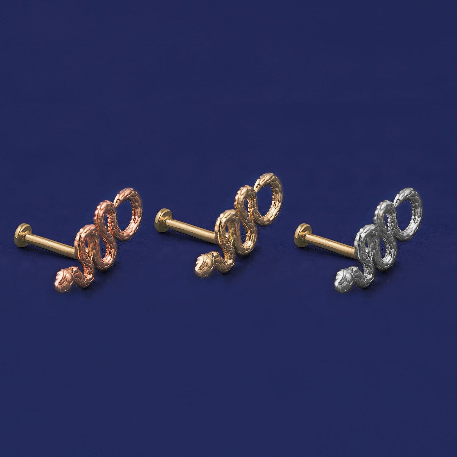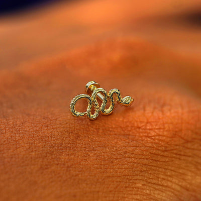Sizzling style, this threadless push in flatback snake stud has it all. Made with 14k solid gold, this dainty snake earring is a comfortably wearable body jewelry piece you’ll never want to take off. Our flat backs are crafted only in 14k yellow gold to avoid sensitivity.