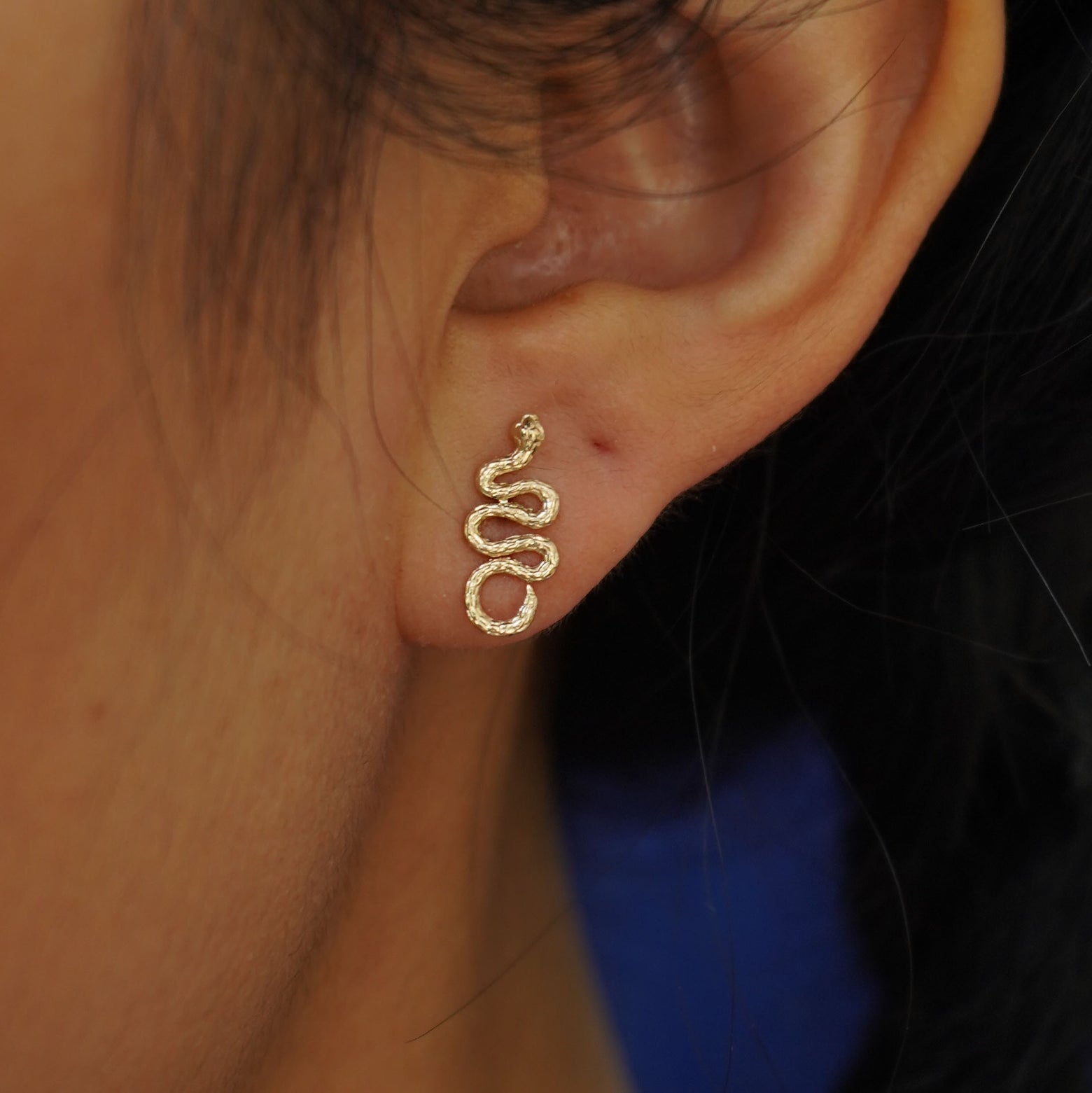 Close up view of a model's ear wearing a yellow gold Snake Flat Back Earring