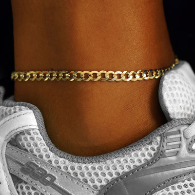A model's ankle wearing a 14k yellow gold Curb Anklet