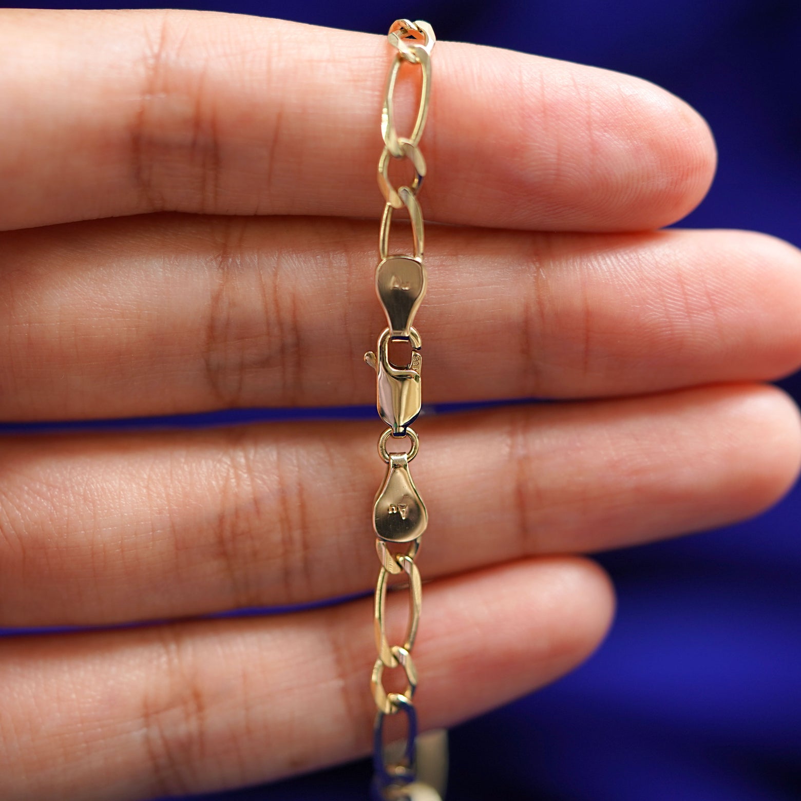 A model holding a 14k yellow gold One to One Bracelet to show the lobster claw clasp