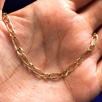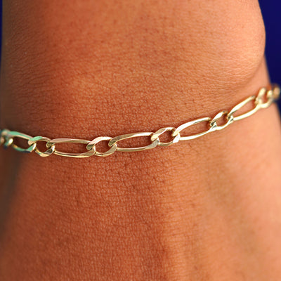 A 14 karat gold link bracelet that's a twist on the classic Figaro style, this One To One bracelet features alternating round and long links. Minimalist jewelry you can wear everyday, this modified Figaro chain bracelet is a sexy, strong, and stylish piece.