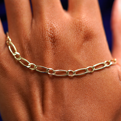 A model's wrist wearing a yellow gold One to One Chain Bracelet
