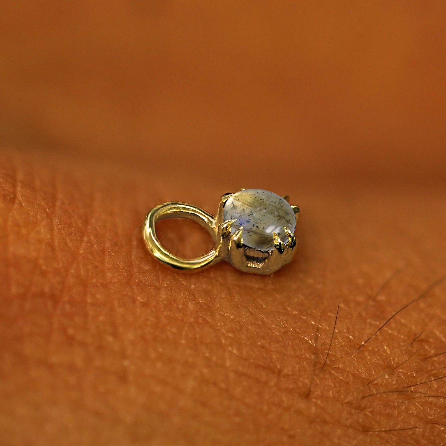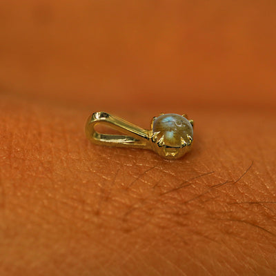 A solid yellow gold Labradorite Charm for earring resting on the back of a model's hand