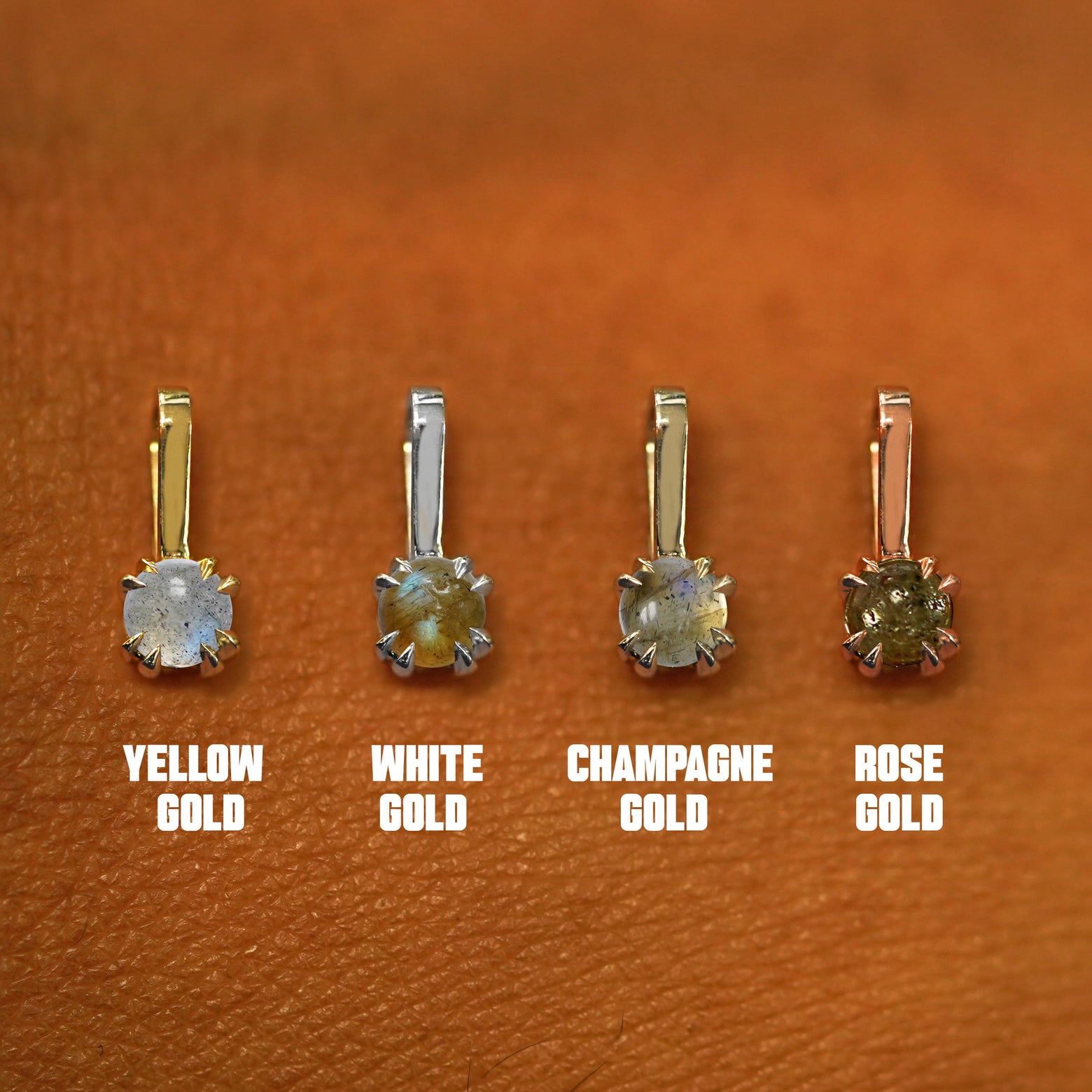 A solid gold Labradorite Charm for chain facedown on a model's fingertip to show the solid back of the charm