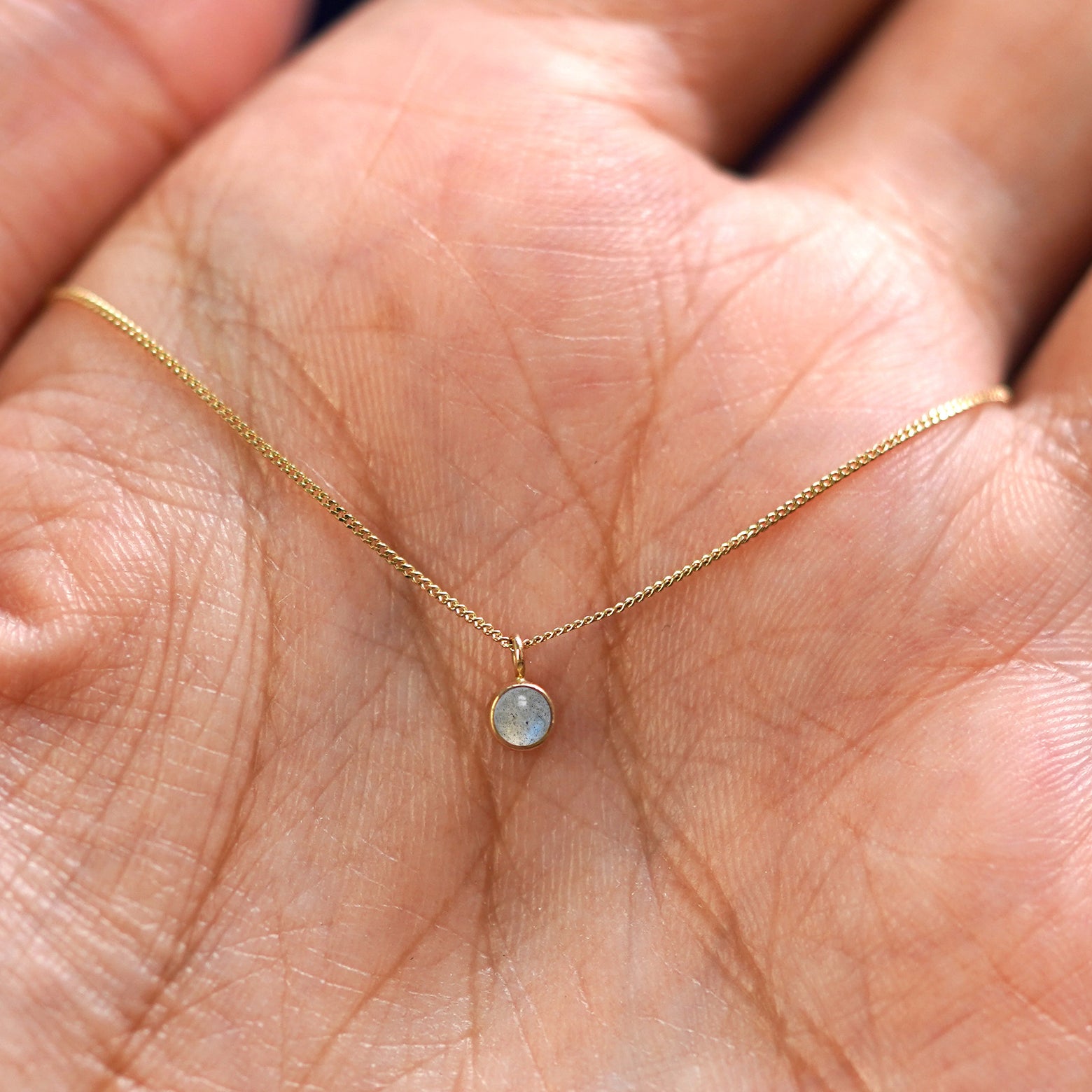 A solid 14k gold Labradorite Necklace resting in a models palm