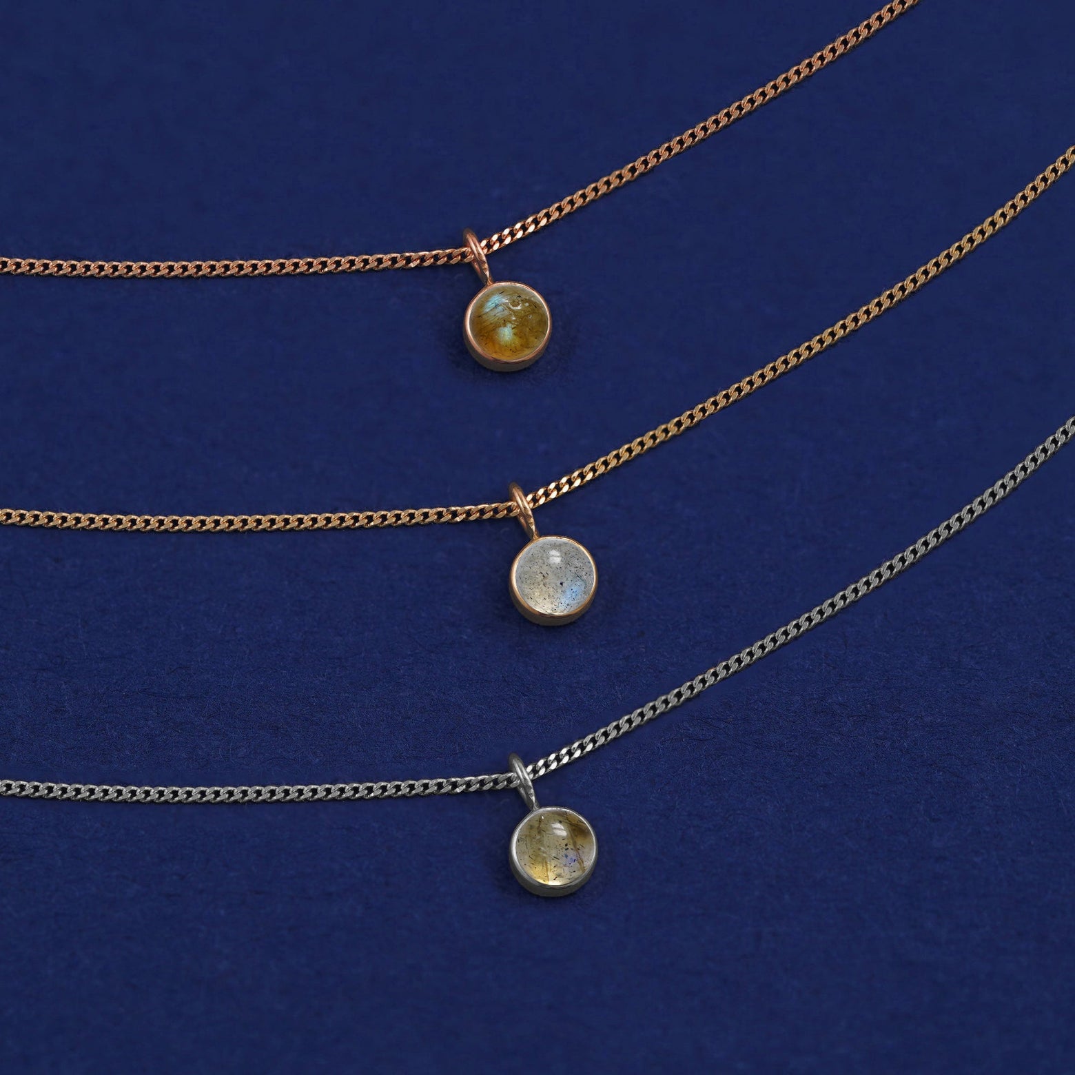 Three versions of the Labradorite Necklace shown in options of yellow, white and rose gold on a dark blue background