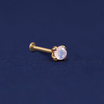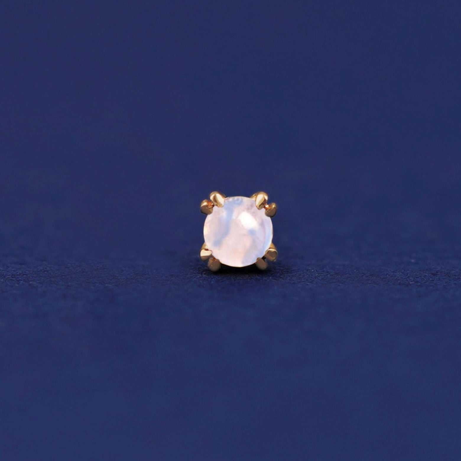 Front facing view of a 14k yellow gold Moonstone Flat Back Earring on a dark blue background