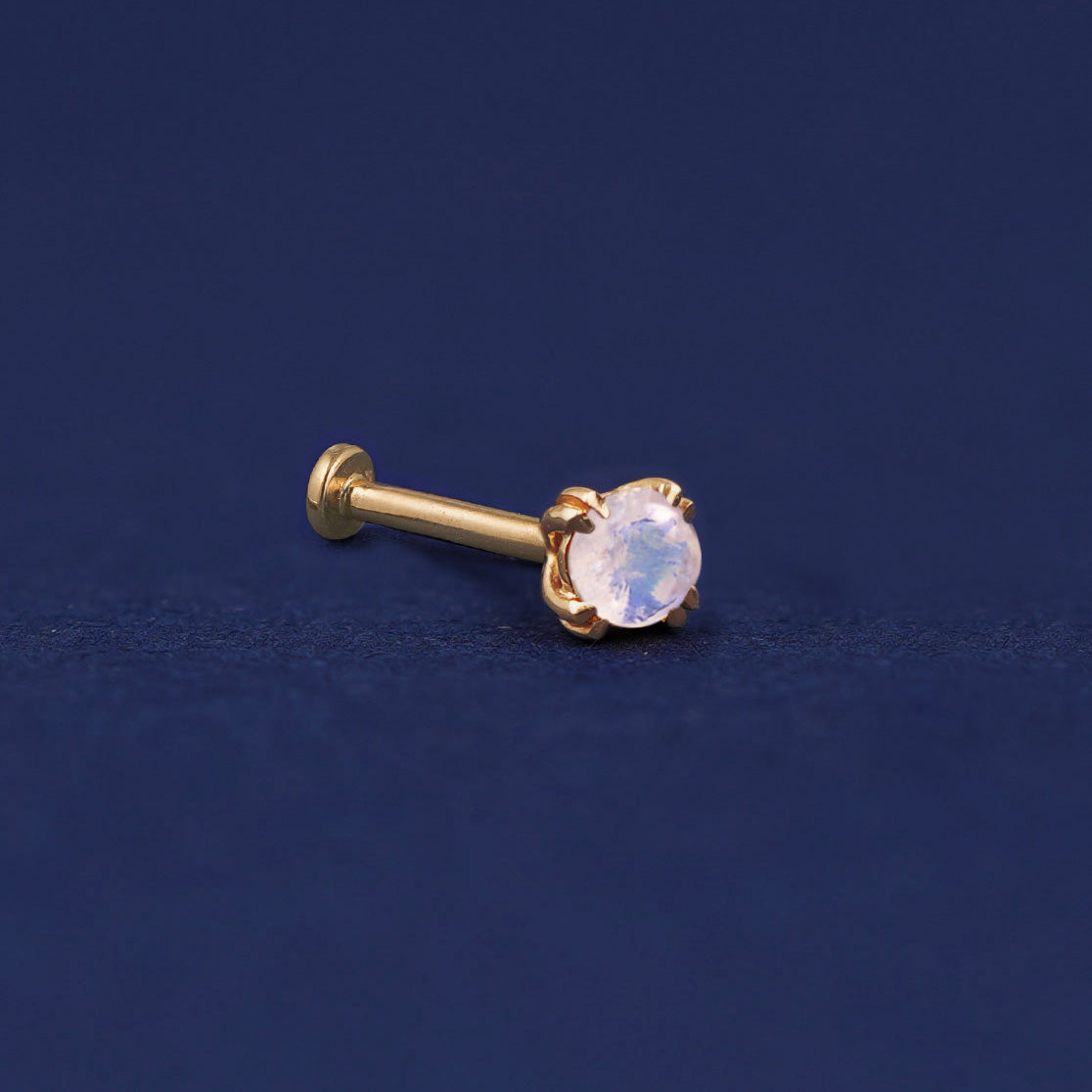 A solid 14k yellow gold Moonstone Flatback Piercing resting on the back of a model's hand