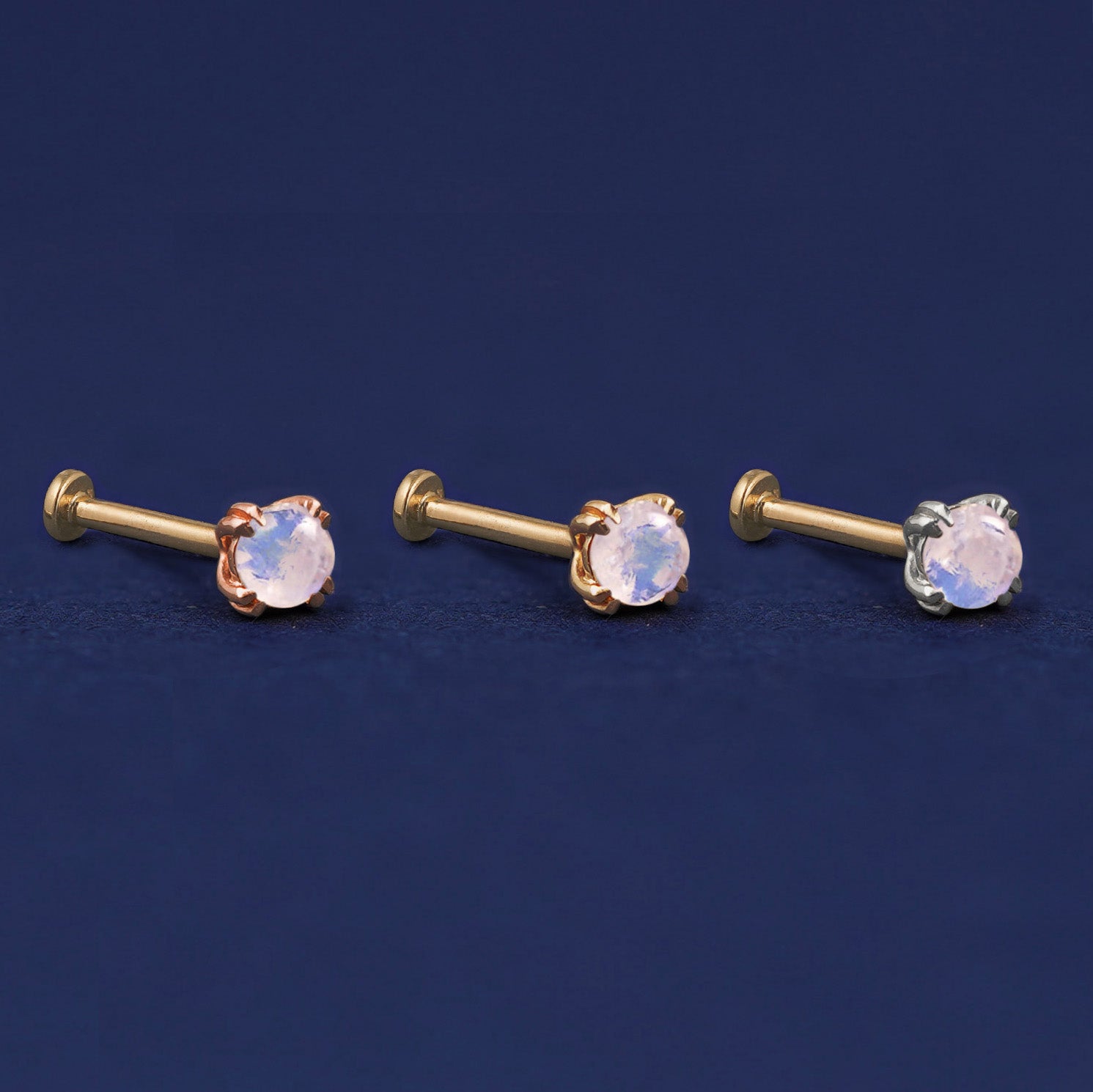 A solid 14k rose gold Moonstone Flatback Piercing resting on the back of a model's hand