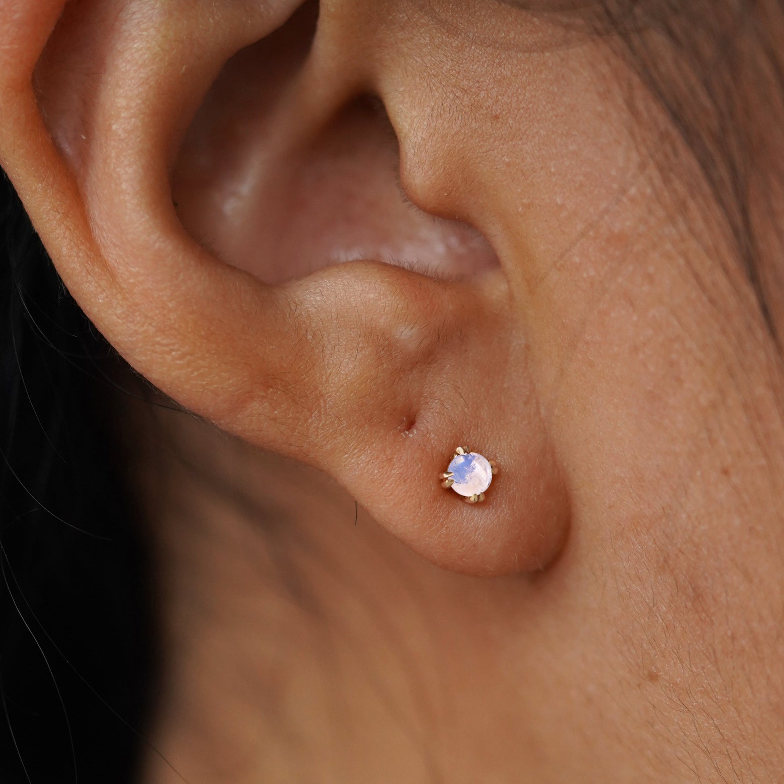 Close up view of a model's ear wearing a yellow gold Moonstone Flat Back Earring