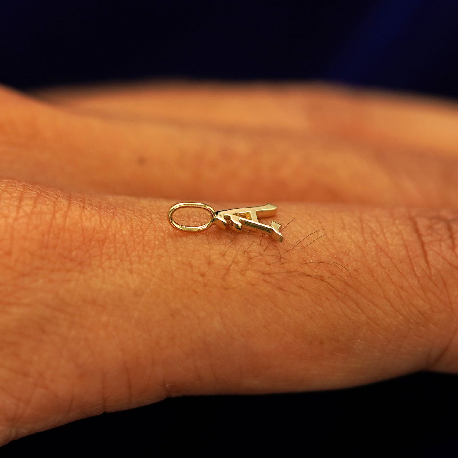 A solid 14k gold Initial Charm for chain in the letter A laying on the back of a model's finger