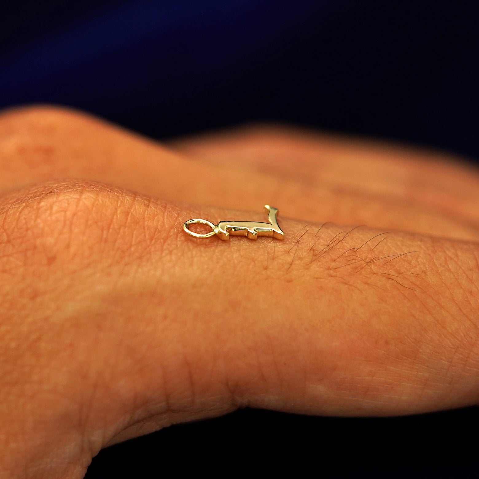 A solid 14k gold Initial Charm for earring in the letter L laying on the back of a model's finger