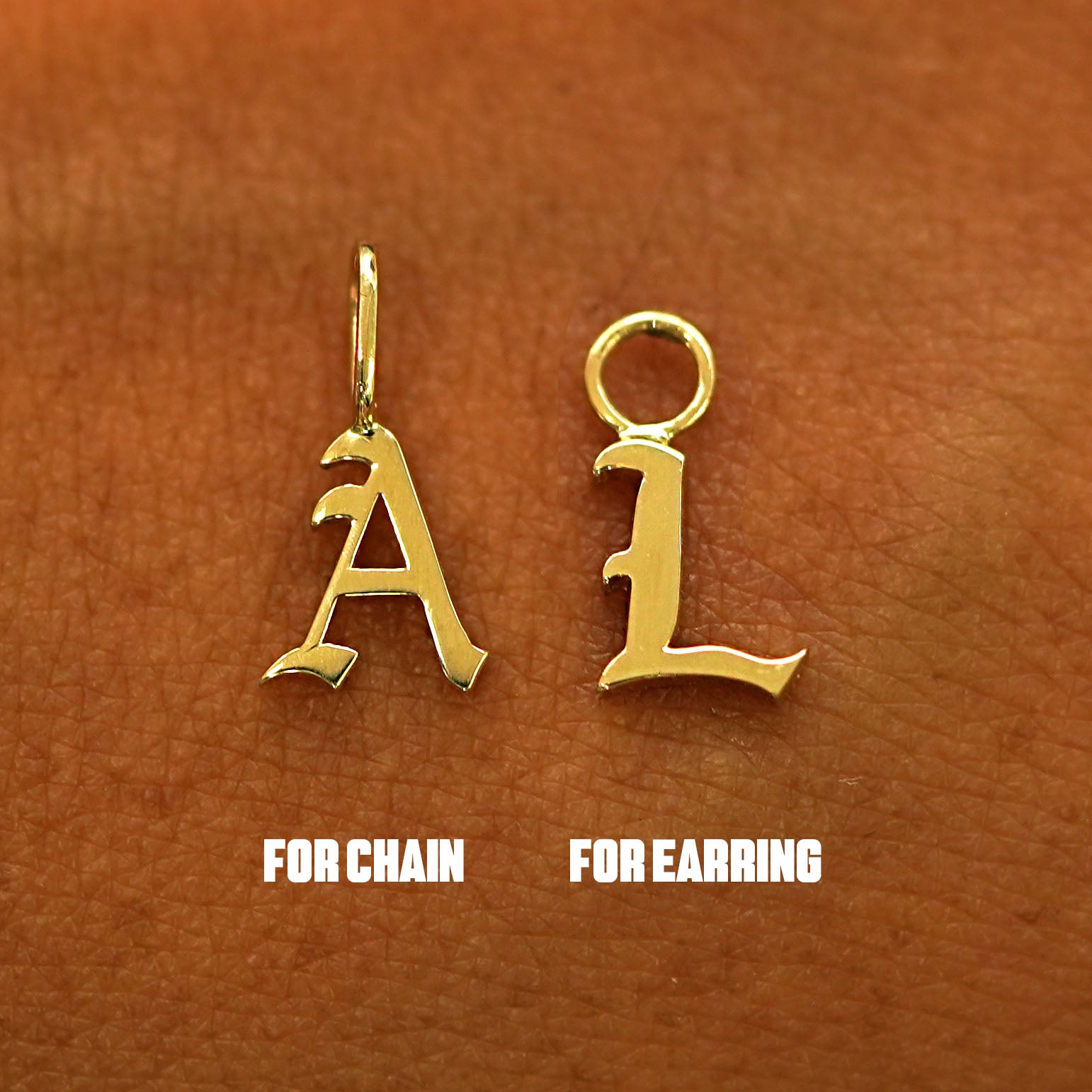 Two versions of the Initial Charm in the letter A and the letter L showing For Chain and For Earring options respectively