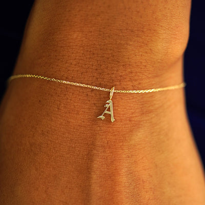 Close up view of a model's wrist wearing a 14k gold letter A Initial Charm on a Cable Bracelet