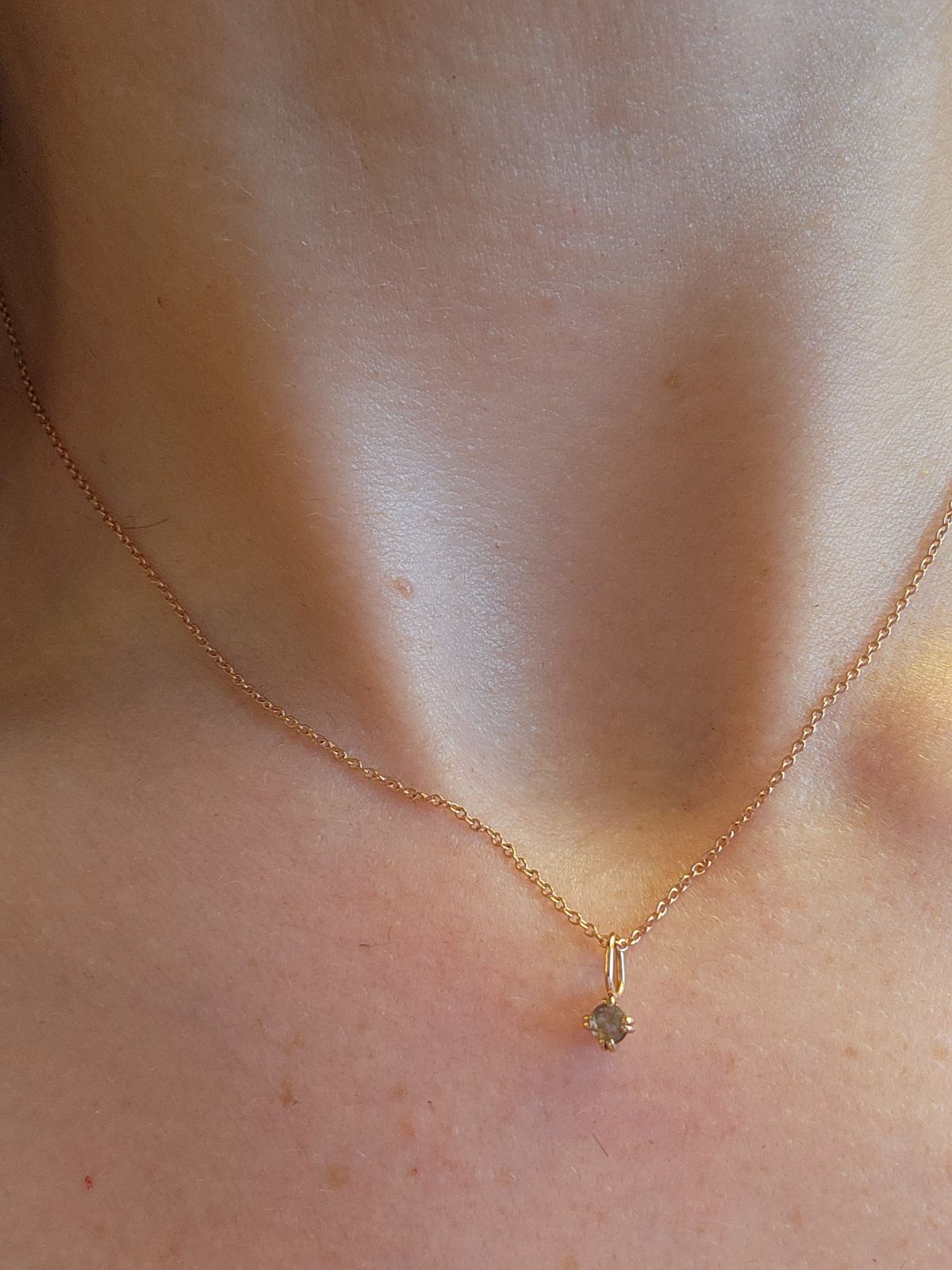 This is my 5th AG piece! Worked with Autumn to choose a specific salt-and-pepper diamond (thank you!), and the result is perfectly tiny dazzling charm that I can wear alone for minimalist effect or with others. I love the high sparkle and neutral gray hue with peppery inclusions. Also, the gothic-modern setting is so unique! Love. Thank you.