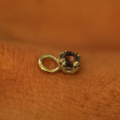 A solid yellow gold Smoky Quartz Charm for earring resting on the back of a model's hand