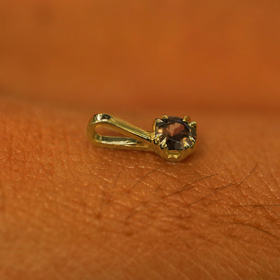 A solid gold Smoky Quartz Charm for earring facedown on a model's fingertip to show the solid back of the charm