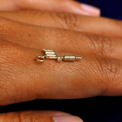 A 14k yellow gold Tattoo Machine Charm for earring balancing on the back of a model's finger