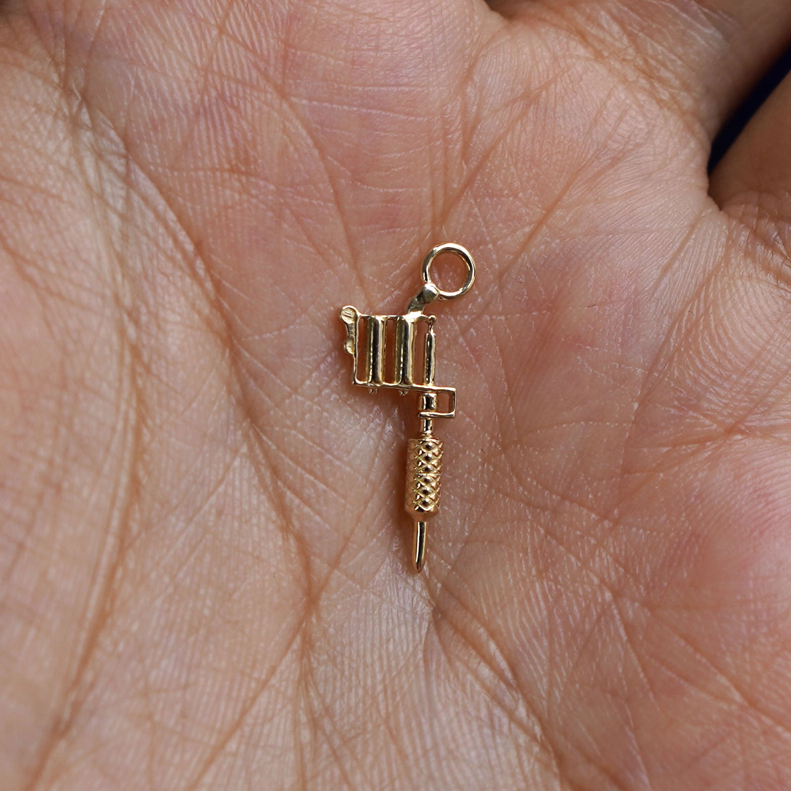 A 14k gold Tattoo Machine Charm for earring resting in a model's palm to show the underside of the charm