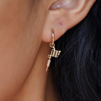 Close up view of a model's ear wearing a yellow gold Tattoo Machine Charm on a Curvy Huggie Hoop