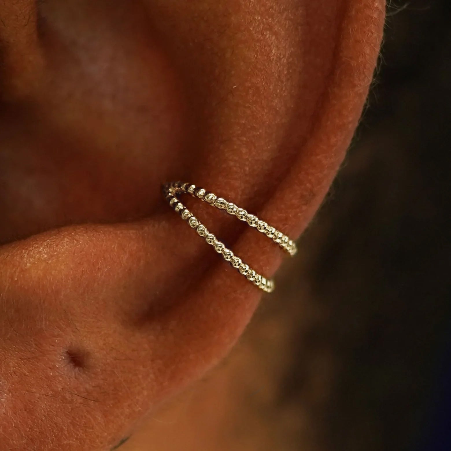 No piercing required for this sweet little Cuff Earring. The beaded design of this non-pierced earring can add soft and comfy texture to your style. Our 14k solid gold ear cuff easily hooks onto your ear so you can get creative and wear this delicate cartilage earring however you want.