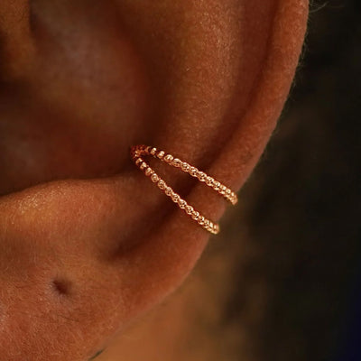 Close up view of a model's ear wearing a 14k rose gold Bead Ear Cuff