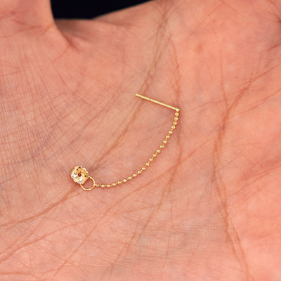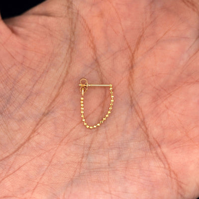 A solid yellow gold Chain Loop with the backing unattached to post sitting in a model's hand