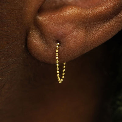 Close up view of a model's wearing a 14k yellow gold Chain Loop Earring