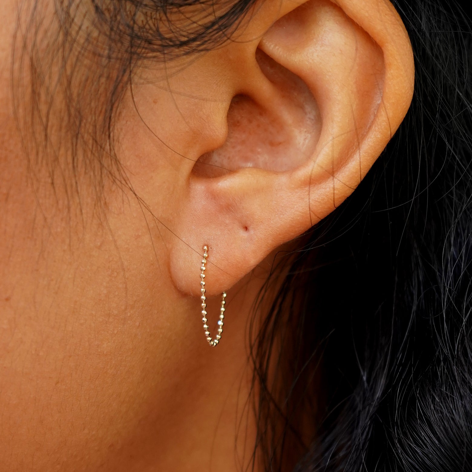 Close up view of a model's wearing a 14k rose gold Chain Loop Earring
