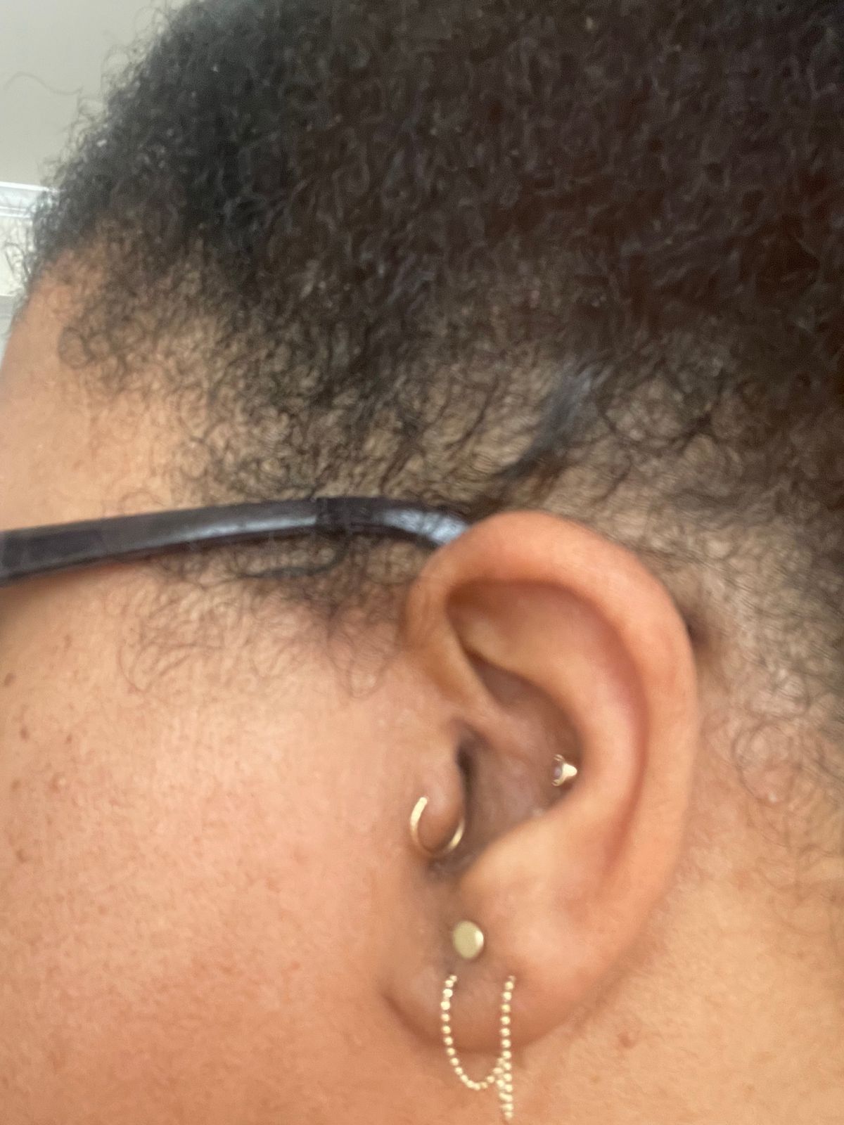 Close up view of a model's ear wearing an Circle Threader wrapped around their ear through three piercings