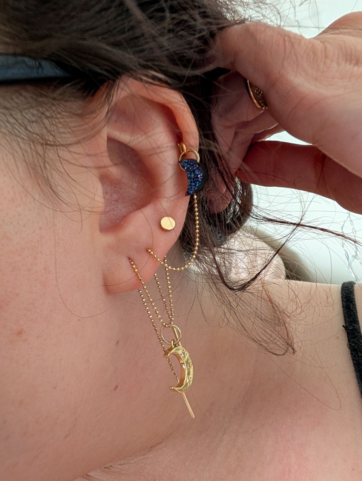 Close up view of a model's ear wearing a Circle Threader looped through two piercings