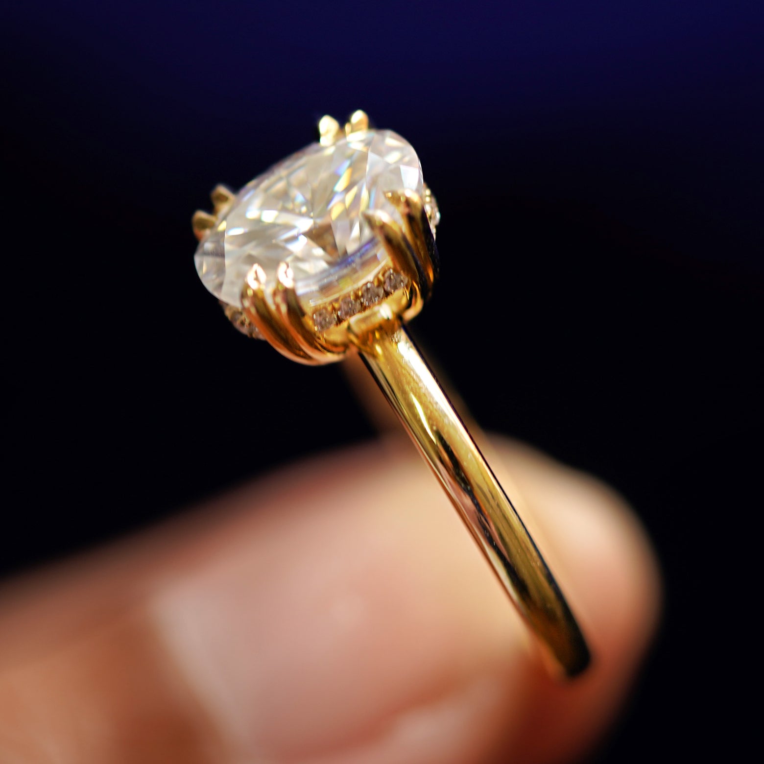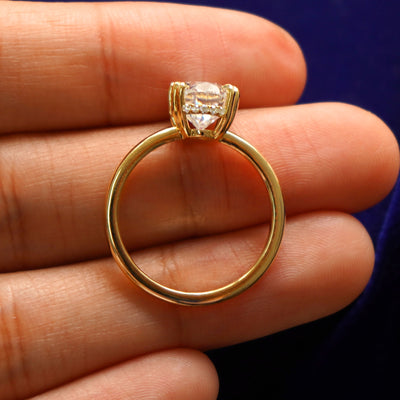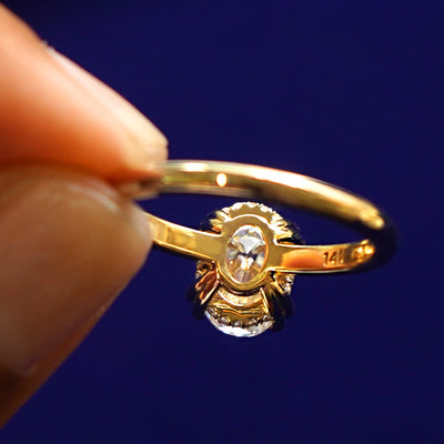 Underside view of a solid 14k gold Oval Moissanite Halo Ring