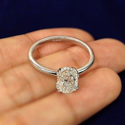 A Oval Moissanite Halo Ring in a model's hand showing the thickness of the band and the height of the ring